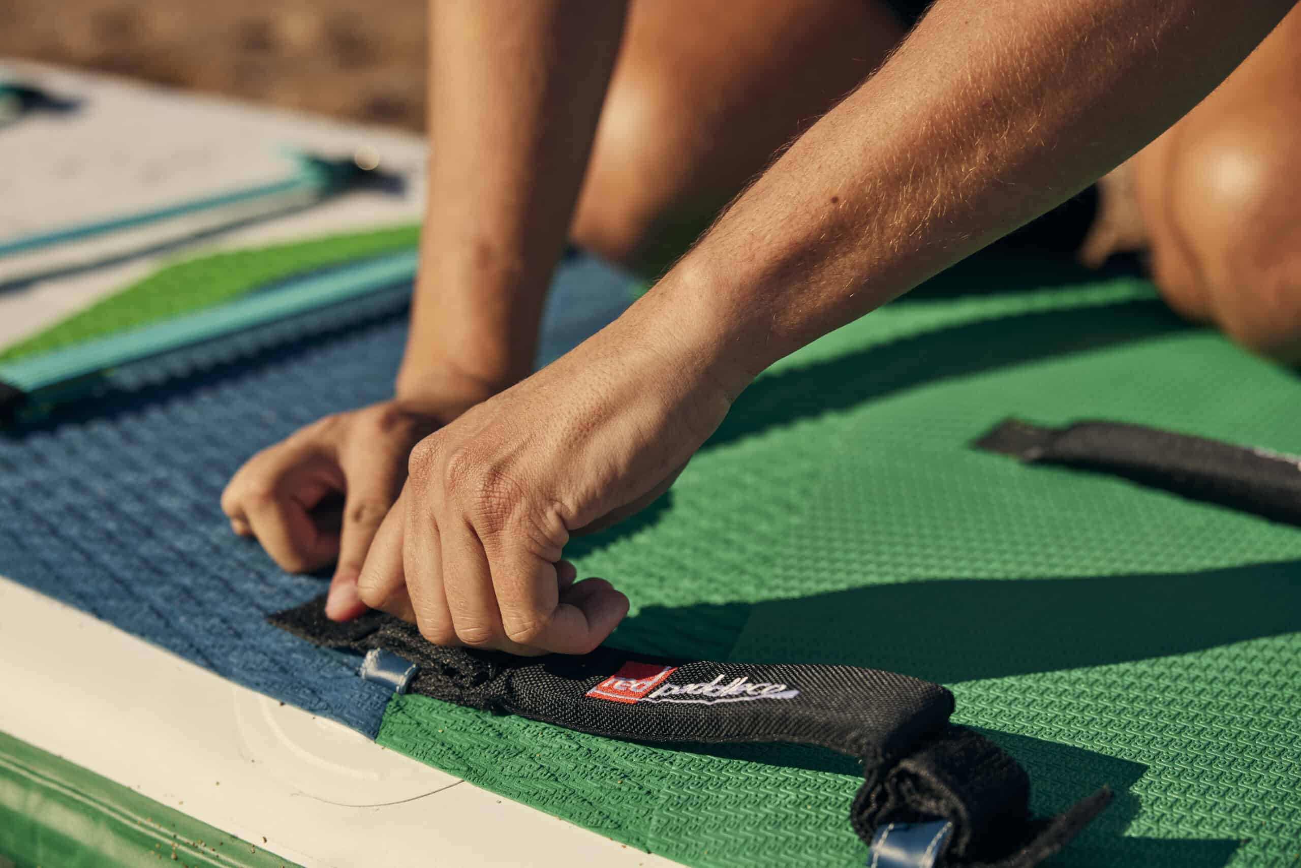 Pour le ranger, posez la planche dégonflée sur le pont, placez la pompe en travers du nose, en laissant suffisamment d’espace pour enrouler la planche. Roulez-la fermement, puis fixez-la avec la sangle. Utilisez la sangle interne du sac à dos pour fixer la planche à l’intérieur.